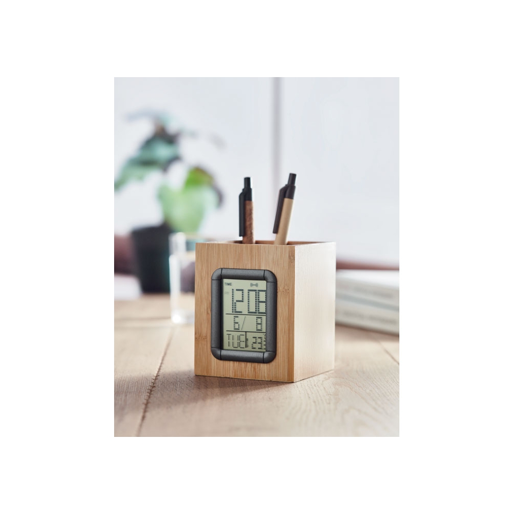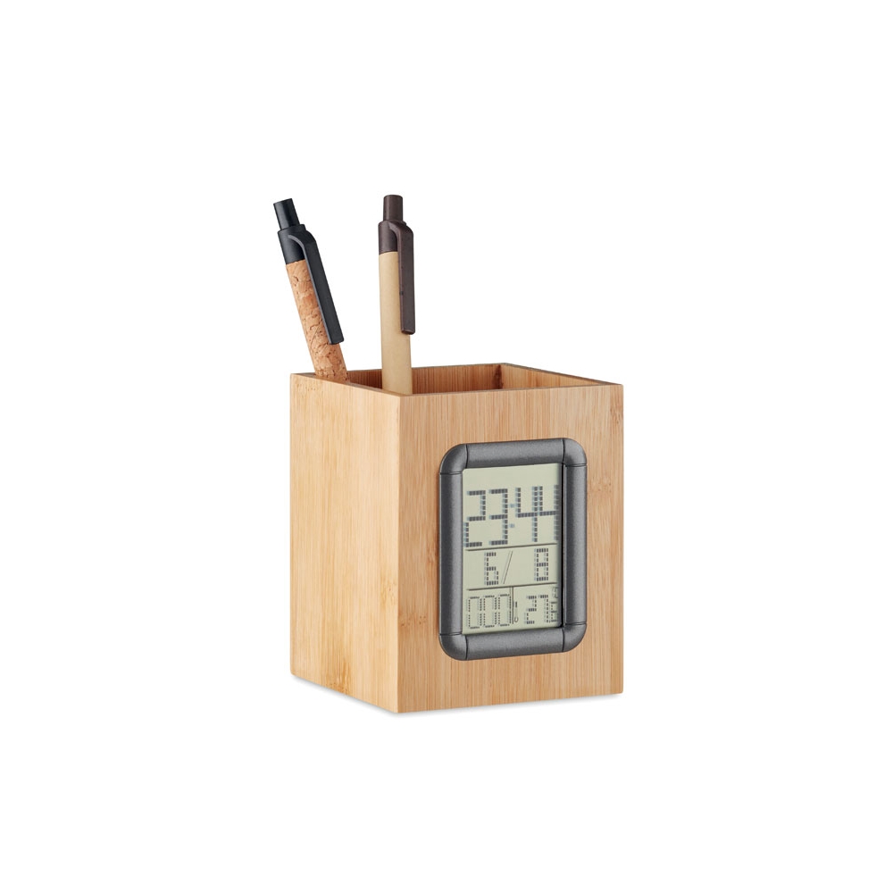 Artikel-Nr: OCBMO6289-40Stiftehalter aus Bambus mit Zeit-, Alarm-, Kalender- und Temperaturanzeige. Inkl. 2 Knopfzellbatterien. Bambus ist ein natürliches Produkt, es kann daher zu leichten Abweichungen in Farbe, Dekor und Maßen kommen.