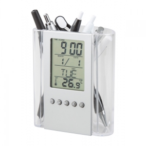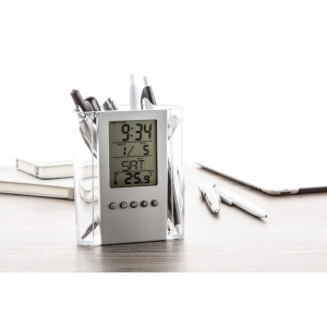 Artikel-Nr: AND813012Transparenter Stifteköcher mit digitalem Display (Uhr, Datum und Thermometer). Inkl. Knopfzellen-Batterien.