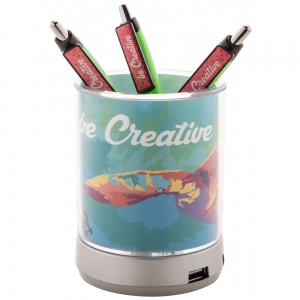 Artikel-Nr: AND809353Schtifteköcher aus ABS-Kunststoff mit USB Hub (USB 2.0, 4 Ports) und blauem Licht. Bedruckung erfolgt auf Papiereinleger (zwischen beiden Wänden).
