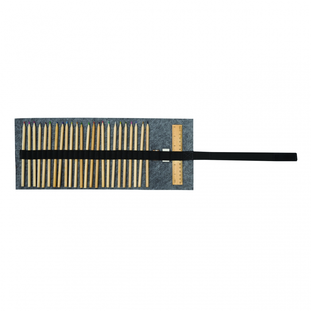 Artikel-Nr: INP56-0504118Stifterolle DRAWLINE: bestehend aus 24 Naturholz-Buntstiften (angespitzt), 1 Anspitzer, 1 Lineal und 1 Radiergummi, in praktischer Filzhülle zum Aufrollen, mit Klettverschluss zum Verschließen