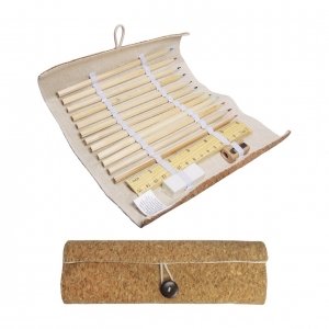 Artikel-Nr: ELT09496020-00000Flexibler Kork. Stifte-Rolle mit Naturkork bezogen. Die Innenseite ist aus leinenfarbenem Textil und beinhaltet einen Radiergummi, einen Spitzer, ein Holzlineal und 12 Buntstifte aus naturbelassenem Holz. Der Überschlag verhindert ein Herausfallen von Utensilien. Verschlossen wird die Rolle mittels Knopf und Gummischlaufe.
