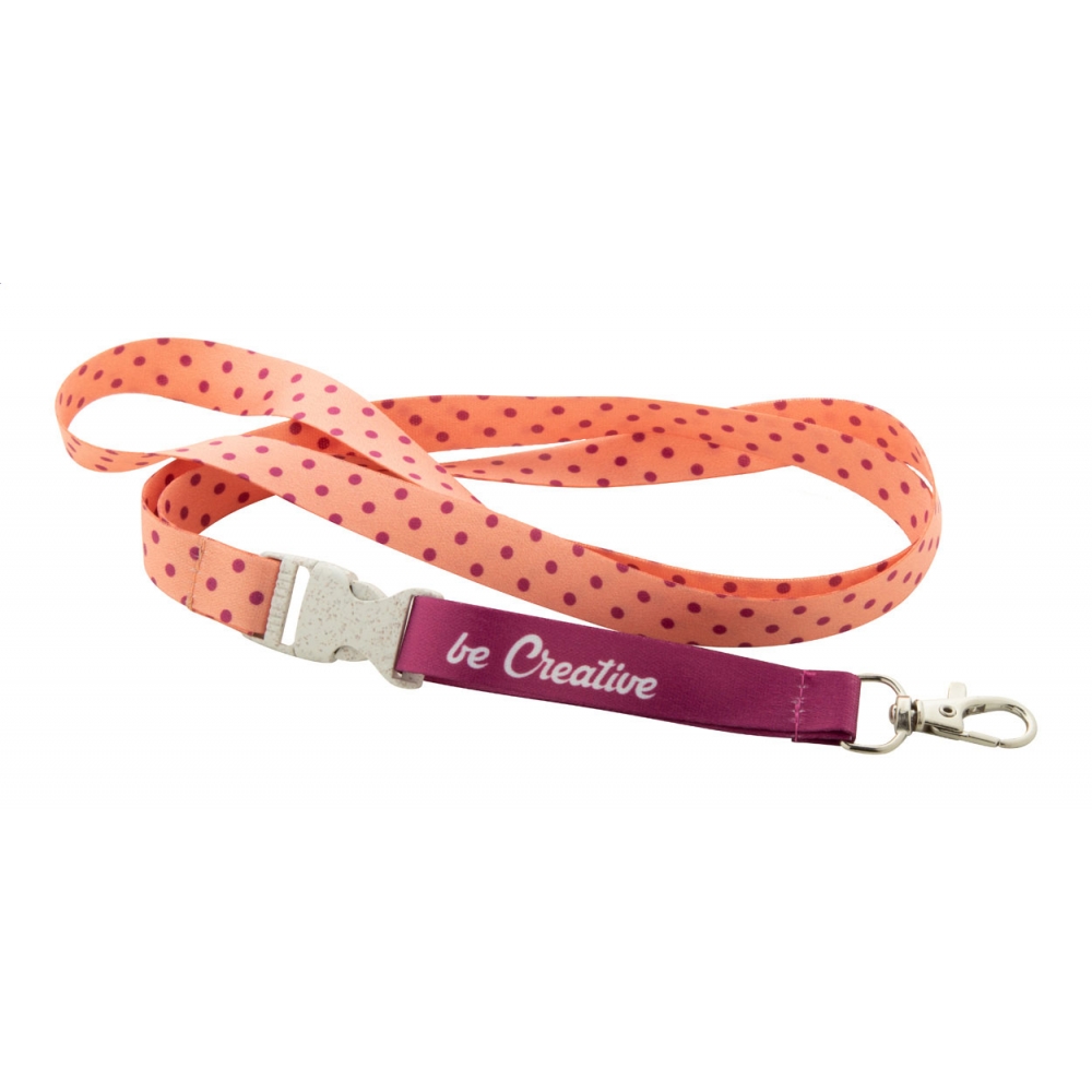 Artikel-Nr: AND718517Individuelles Lanyard aus RPET, 15 mm breit, mit abnehmbaren Metallkarabiner und Verschluss aus Weizenstrohkunststoff. Der Preis ist inkl. Sublimationsdruck auf beiden Seiten. Mindestmenge: 100 Stk.