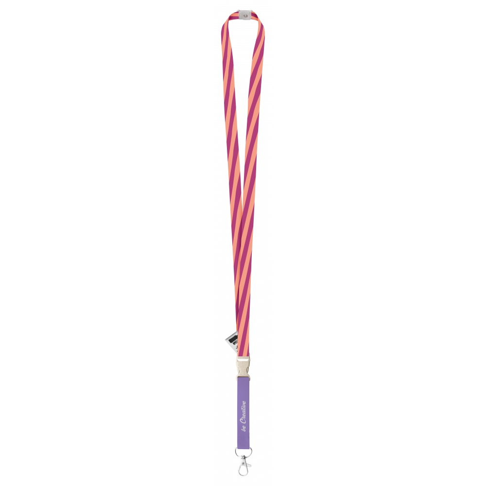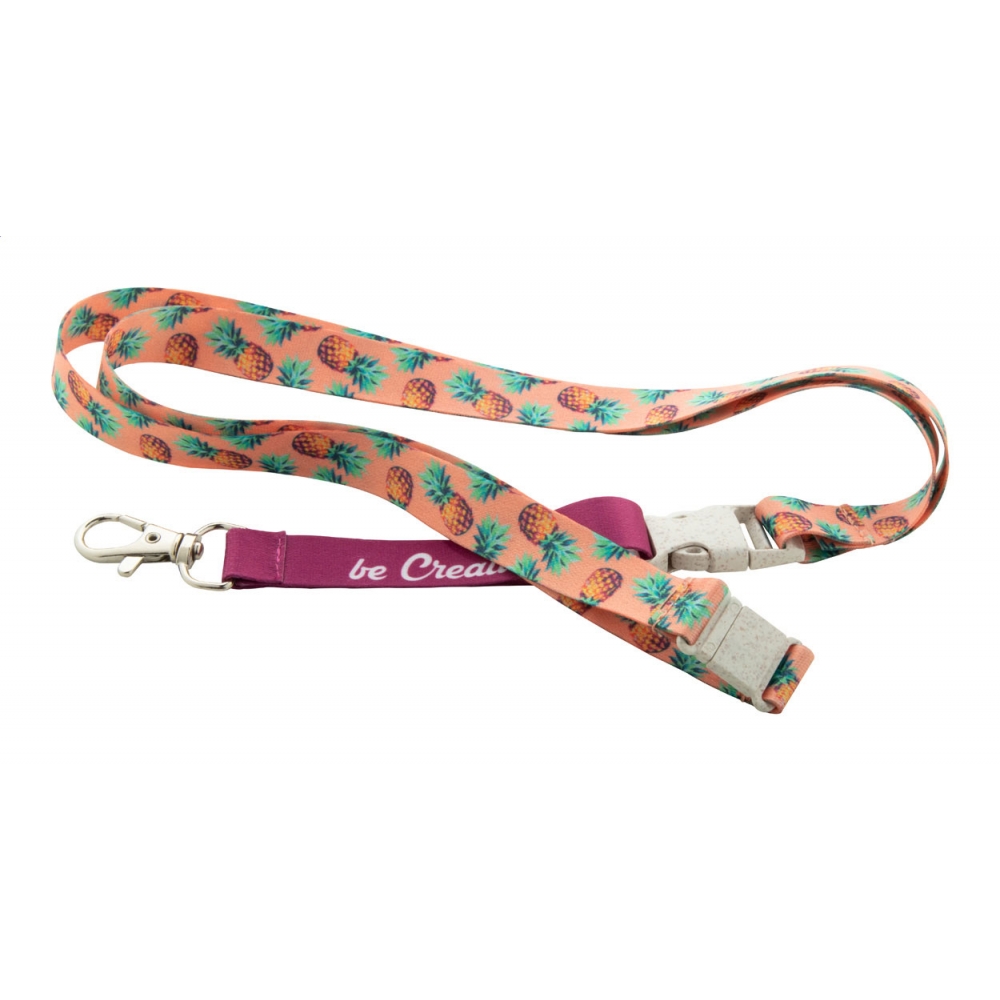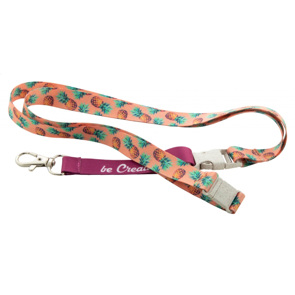 Artikel-Nr: AND718519Individuelles Lanyard aus RPET, 15 mm breit, mit abnehmbaren Metallkarabiner und Panikverschluss aus Weizenstrohkunststoff. Der Preis ist inkl. Sublimationsdruck auf beiden Seiten. Mindestmenge: 100 Stk.