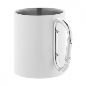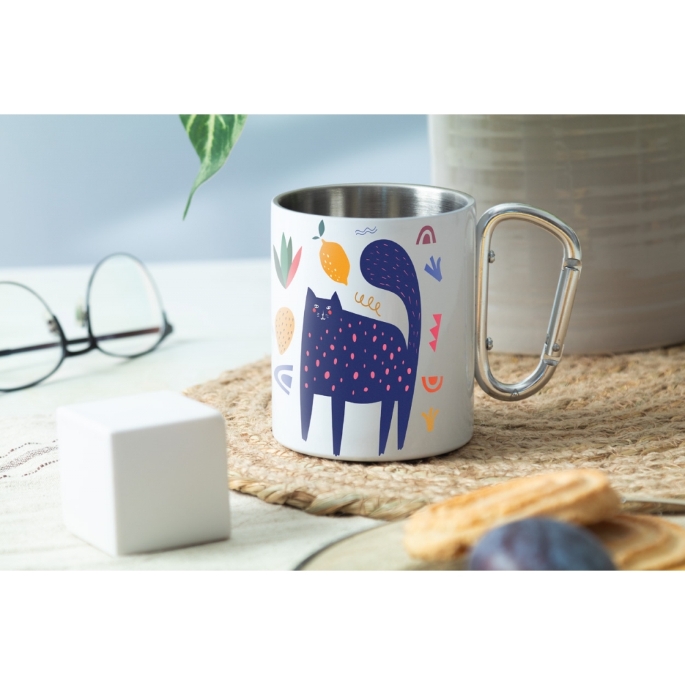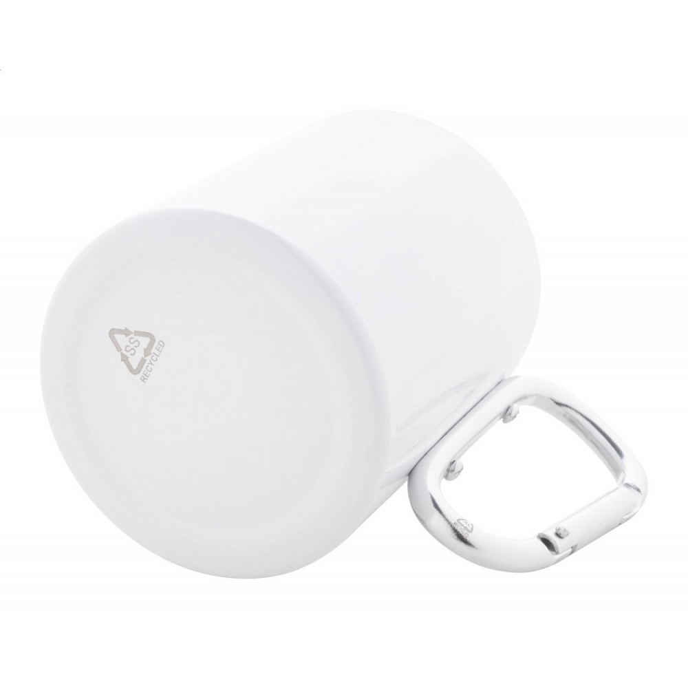 Artikel-Nr: AND807907-01Doppelwandige Sublimations-Thermotasse aus recyceltem Edelstahl mit Karabinerhenkel aus recyceltem Aluminium. Füllmenge: 300 ml. Einzeln in Kraftpapierbox.