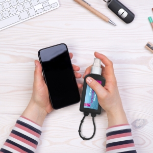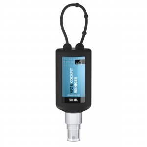Artikel-Nr: SAN20-314-267-100Praktische Kosmetikflasche zum Anhängen! Das Spray mit Silikonhülle ist nicht nur optisch ein echter Hingucker! Raffiniert mit Schlaufe zum Anhängen an de Strandtasche, den Wander-Rucksack, den Ski-Anorak oder an den Kinderwagen. 50 ml PET Flasche (weiß) mit weißem Pumpaufsatz und transparenter Schutzkappe; Silikonhülle und Schlaufe in Nachfüllbar. Flasche hergestellt aus 100% recyceltem PET, weiß mit leichter R-PET-Färbung. Das Reinigungsspray entfernt Verschmutzungen materialschonend. Es ist bestens geeignet für die schnelle und unkomplizierte Reinigung des gesamten Kfz Cockpits, insbesondere von Displays und Lenkrad sowie allen anderen Oberflächen. Anwendung ohne Wasser: Aufsprühen, kurz einwirken lassen und mit einem Tuch abwischen. Der Reiniger hinterlässt einen angenehmen, frischen Zitronenduft und einen matten Glanz. • Lösemittelfrei • Native Rohstoffe • Biologisch abbaubar • Vegan • Hergestellt in Deutschland Dekoration: Body Label: Etikett PE (weiß), Druck 4c CMYK. Wahlweise glänzend oder matt.