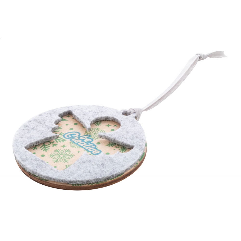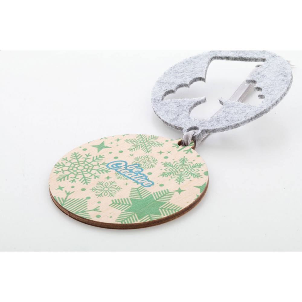 Artikel-Nr: AND716791-BIndividueller, zweilagiger Weihnachtsbaumanhänger aus RPET-Filz und Birkensperrholz mit silberner Schleife und gestanztem Weihnachtsmotiv. Der Preis ist inklusive UV-LED-Druck auf dem Holzteil. Mindestmenge: 100 Stk.