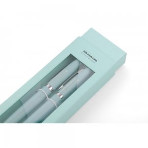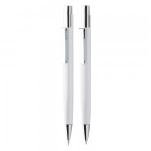 Schreibset bestehend aus einem blauschreibenden Aluminium Kugelschreiber mit einer Kunststoffgroßraummine und einem passenden Aluminium Druckbleistift mit zwei Bleistiftminen (0,5 mm). Beide Stifte verfügen über eine rubber finish Oberfläche die für eine angenehme Hapitk sorgt, das Etui besteht aus recyceltem PU. Ihre Werbung drucken wir auf das Etui. Gravur auf den Stiften auf Anfrage möglich.