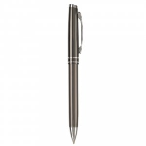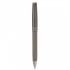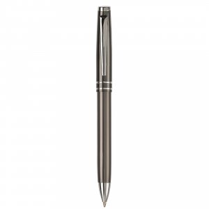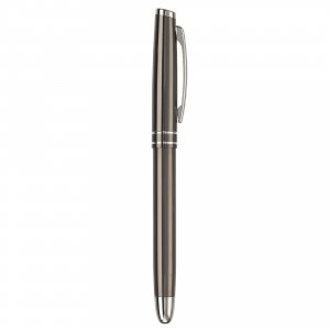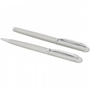 Metallschreibset bestehend aus einem Kugelschreiber mit Drehmechanik und einem Rollerball mit Kappe. Versehen mit einem feinen Streifendesign. Blauschreibend.