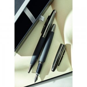 Schreibset BLACK ELEGANCE: bestehend aus Kugelschreiber mit Drehmechanismus und Metall-Großraummine (schwarzschreibend) sowie Füller inklusive Tintenpatrone (blauschreibend) in Gun-Metall-Optik mit gummierter Griffzone, schwarze Geschenkbox mit Schublade und Schmuckkante aus Aluminium