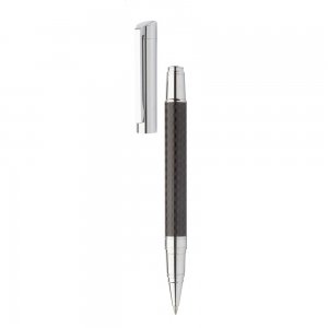 Elegantes Schreibset aus Metall mit Carbon-Muster auf dem Schaft und verchromten Elementen. Das Set besteht aus Kugelschreiber und Rollerball. Blauschreibend. Einzeln in schwarzer Geschenkbox. Marke: André Philippe.