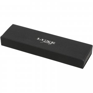 Exklusiv gestaltetes Schreibset aus Kugelschreiber zum Drehen und Tintenroller mit Kappe. Erhältlich in glänzendem Schwarz, mattem Silber und mattem Blau. Verpackt in einer "LUXE"-Präsentschachtel (17 x 5,5 x 3 cm).