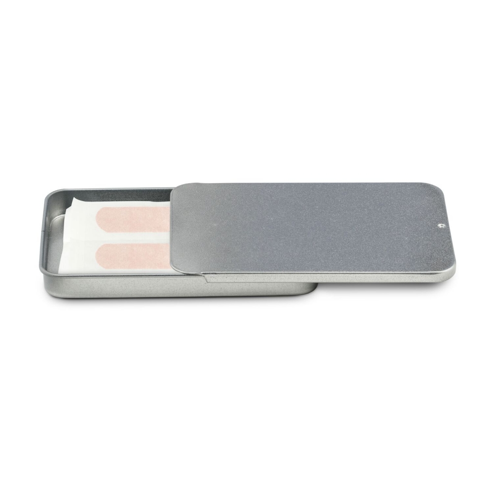 Mit dieser Pflaster-Schiebebox haben Sie ein praktisches kleines Erste Hilfe Set zur Hand. Die robuste aber leichte Schiebebox aus Metall schützt den Inhalt optimal vor Außeneinwirkungen und passt doch bequem in jede Tasche. Ideal für unterwegs! Nach Verbrauch der ersten Füllung kann die Schiebebox nach Belieben wieder befüllt werden, z. B. mit anderen Pflastern, Medikamenten für unterwegs oder auch mit Nähutensilien als kleines Nähset. Das ist praktisch und Ihre Werbung bleibt nachhaltig im Einsatz! Die Schiebebox ist mit 10 Qualitätspflasterstreifen (ca. 60 x 20 mm, einzeln versiegelt) befüllt. Die Schiebebox (ca. 96 x 60 x 11 mm) lässt sich mit einer Gravur und / oder einem individuellen Einleger nach Kundenwunsch branden. Durch die geringen Maße und das leichte Gewicht bietet sich dieser günstige und doch nützliche Streuartikel für ein Mailing oder als Messe-Give-Away geradezu an. Als Inhalt können Sie zwischen 10 Standardpflastern hergestellt in Europa, 10 Fan-Pflastern im Deutschland-Motiv hergestellt in Europa, 10 Monster-Pflastern für Kinder hergestellt in Europa, 10 Sensitiv Markenpflastern (Made in Germany) oder 4 Blasenpflastern hergestellt in Europa wählen.