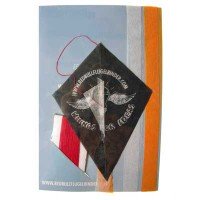 Der Mini-Drachen ist mit zwei langen Flatterbändern versehen, die auf der Werbekarte in Postkartengröße aufgewickelt sind. Die Schnur ist ebenfalls auf einer kleinen Pappe aufgewickelt. Alles zusammen ist säuberlich in eine Cellophanverpackung kuvertiert.