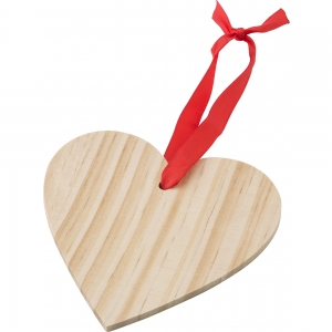 Weihnachtsbaumanhänger 'X-MAS Heart' aus Holz in Herz-Form. Der Anhänger ist mit einem roten Bändchen versehen, an dem er einfach aufgehängt werden kann.