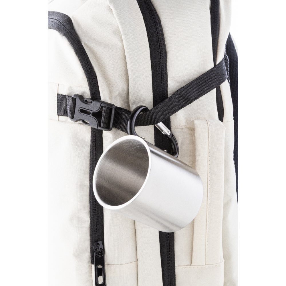 Edelstahlbecher mit farbigem Karabinergriff. Füllmenge: 200 ml.