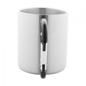 Edelstahlbecher mit 220 ml Fassungsvermögen mit metallisch glänzender Oberfläche und funktionellem Karabinergriff in verschiedenen Farben, der das Tragen erleichtert. Präsentiert in einer Schachtel aus Kraftkarton.