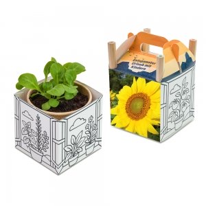 Artikel-Nr: HOP12.10052.00-somDas Color & Grow House vereint Kreativität und Natur in einem einzigartigen Giveaway. Der stabile Papierwürfel ist auf seinen Seitenflächen mit liebevoll illustrierten Motiven zum Thema Gewächshaus bedruckt – bereit, bunt ausgemalt zu werden. Vier mitgelieferte Buntstifte machen das kreative Erlebnis komplett. Im Inneren verbirgt sich ein Pappbecher mit einer Substrattablette als Erde sowie Samen nach Wahl. So wird aus dem bemalten Würfel ein kleines Pflanzprojekt mit nachhaltigem Mehrwert. Der raffinierte Verschluss des Würfels bietet Platz für eine individuell gestaltete Werbebotschaft im Digitaldruck.