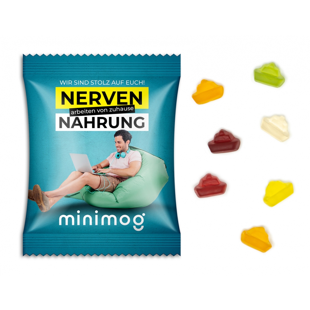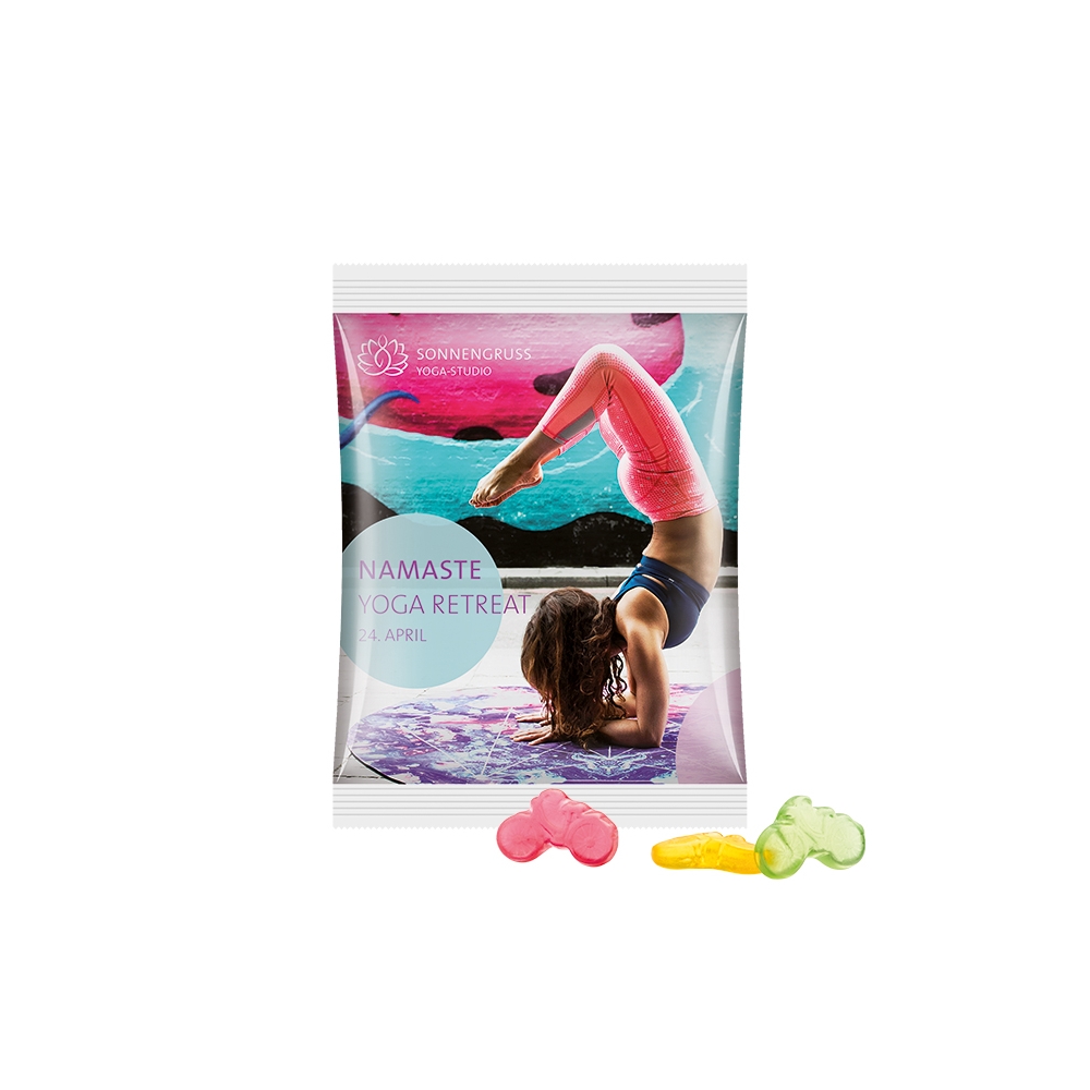 Fruchtgummi Standardformen im individuell bedruckten Werbetütchen.