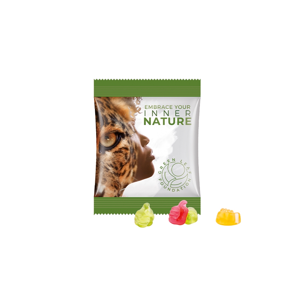 Artikel-Nr: PUC1021.00317Trolli Fruchtgummi in Tüte aus weißer Folie, individuell bedruckt. Inhalt: Trolli Fruchtgummi Daumen, in Premium Qualität mit 10 % Fruchtsaftanteil, bunt gemischt, 15 g