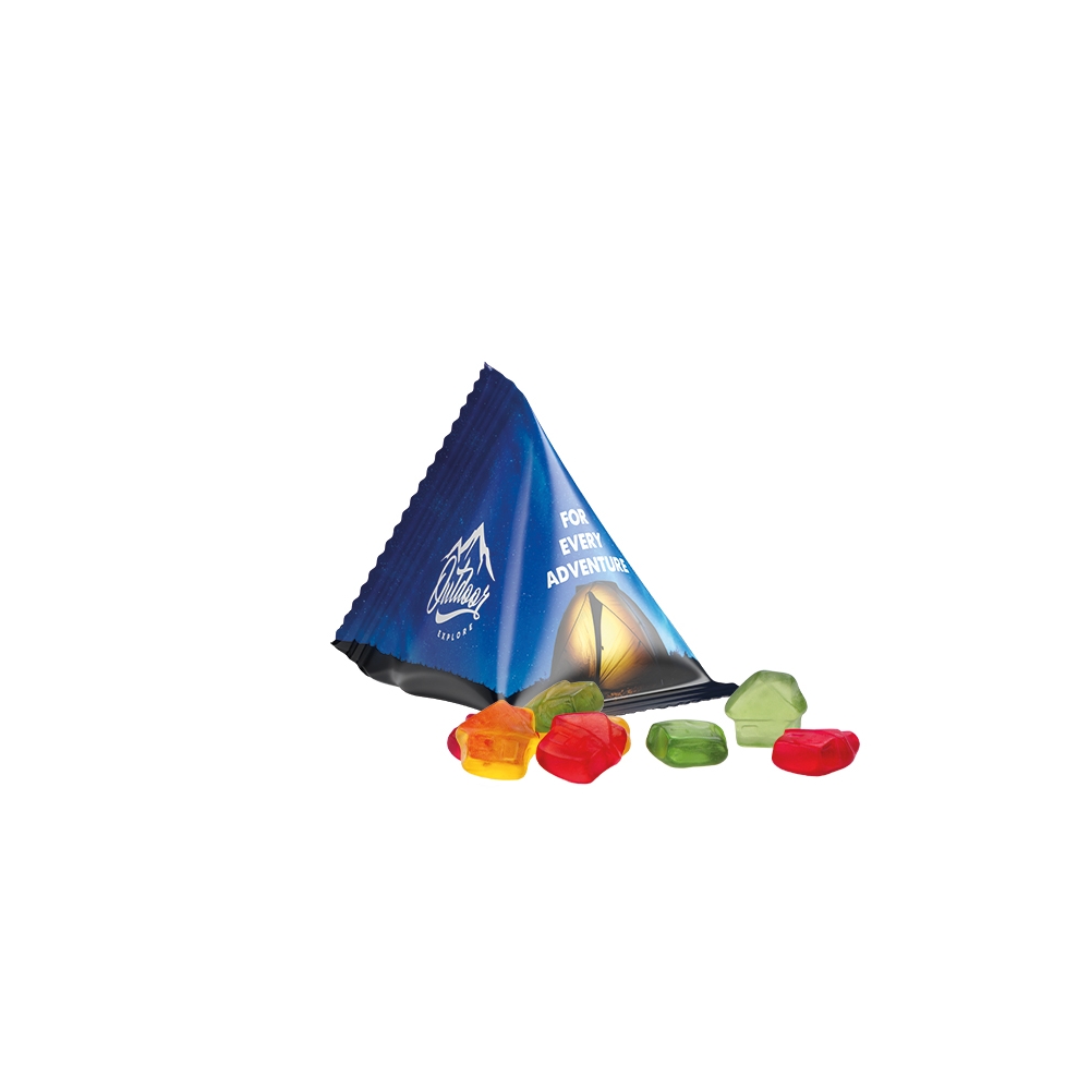 Fruchtgummi verpackt im individuell bedruckten Tetraeder.