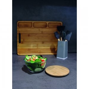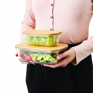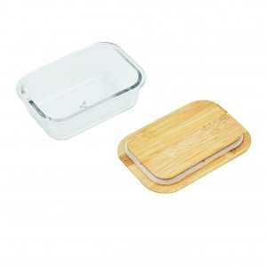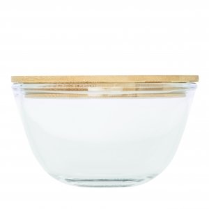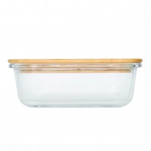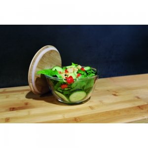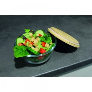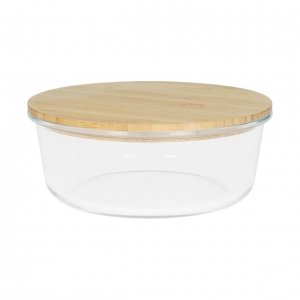 Schöne runde Box mit einer Schale aus hochwertigem und hitzebeständigem Borosilikat-Glas. Der Deckel aus Bambus verfügt über einen Silikonring und hält somit besonders gut auf der Schale. Die Glasschale ist für die Verwendung in der Mikrowelle geeignet.