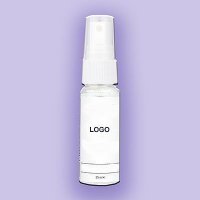 Transparente Sprühflasche gefüllt mit alkoholfreiem Desinfektionsmittel, mit geschraubtem Sprühaufsatz, nachfüllbar, Inhalt 25ml Etikett: 4c (Digitaldruck) auf weißer PE-Folie