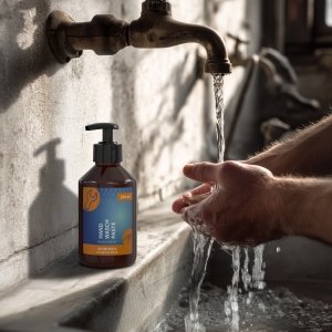Profi-Handwaschpaste, 250 ml Pumpspender Braune Flasche, hergestellt aus 100% recyceltem PET, mit schwarzer Pumpe. Nachfüllbar. Der konzentrierte, pastöse Profi-Handreiniger mit Doppelwirkung entfernt zuverlässig starke Verschmutzungen wie Öle, Fette, Schmierstoffe, vielerlei Druckfarben, Stäube und natürlich auch einfachen Schmutz besonders hautfreundlich. Ob in Industrie, Handwerk, Garten, Werkstatt oder Hobbykeller: Der Profi-Handreiniger ist universell einsetzbar. Doppelwirkung aus Reinigung und Schutz: Der Profi Handreiniger reinigt porentief mit natürlichen Reibekörnern aus fein vermahlenem und abgerundetem Mehl aus Walnussschalen (keine Kunststoffe). Das komplex wirkendende Tensid-System aus nachwachsenden Rohstoffen ist selbstverständlich gemäß OECD-Screening-Test biologisch abbaubar. • Nachhaltiger Hautschutz • Hochwertige Fettstoffe natürlichen Ursprungs • pH hautneutral • Verstopft nicht den Abfluss • Ohne Silikon und Lösemittel Sparsam im Gebrauch: Nur 3 ml sind ausreichend für eine gründliche Handreinigung. Einfach in die trockenen Hände einreiben, bis sich der Schmutz löst. Etwas Wasser zugeben, gründlich waschen und gut abspülen. Dermatologisch getestet "Sehr gut hautverträglich". Hergestellt in Deutschland. Dekoration: Body Label: Mattes Etikett (weiß) auf Vorder- und Rückseite, Druck 4c CMYK. Füllung: 250 ml