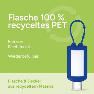 Praktische Kosmetikflasche zum Anhängen! Das Fläschchen mit Silikonhülle ist nicht nur optisch ein echter Hingucker! Raffiniert mit Schlaufe zum den, an den Rucksack oder an den 50 ml Flasche und Klappdeckel (zufällig ausgerichtet) weiß; Silikonhülle und Schlaufe in Nachfüllbar. Flasche hergestellt aus 100% recyceltem PET, weiß mit leichter R-PET-Färbung. Der konzentrierte, pastöse Profi-Handreiniger mit Doppelwirkung entfernt zuverlässig starke Verschmutzungen wie Öle, Fette, Schmierstoffe, vielerlei Druckfarben, Stäube und natürlich auch einfachen Schmutz besonders hautfreundlich. Ob in Industrie, Handwerk, Garten, Werkstatt oder Hobbykeller: Der Profi-Handreiniger ist universell einsetzbar. Doppelwirkung aus Reinigung und Schutz: Der Profi Handreiniger reinigt porentief mit natürlichen Reibekörnern aus fein vermahlenem und abgerundetem Mehl aus Walnussschalen (keine Kunststoffe). Das komplex wirkendende Tensid-System aus nachwachsenden Rohstoffen ist selbstverständlich gemäß OECD-Screening-Test biologisch abbaubar. • Nachhaltiger Hautschutz • Hochwertige Fettstoffe natürlichen Ursprungs • pH hautneutral • Verstopft nicht den Abfluss • Ohne Silikon und Lösemittel Sparsam im Gebrauch: Nur 3 ml sind ausreichend für eine gründliche Handreinigung. Einfach in die trockenen Hände einreiben, bis sich der Schmutz löst. Etwas Wasser zugeben, gründlich waschen und gut abspülen. Dermatologisch getestet "Sehr gut hautverträglich". Hergestellt in Deutschland. Dekoration: Body Label: Etikett PE (weiß) auf Vorder- und Rückseite, Druck 4c CMYK. Wahlweise glänzend oder matt. Füllung: 50ml