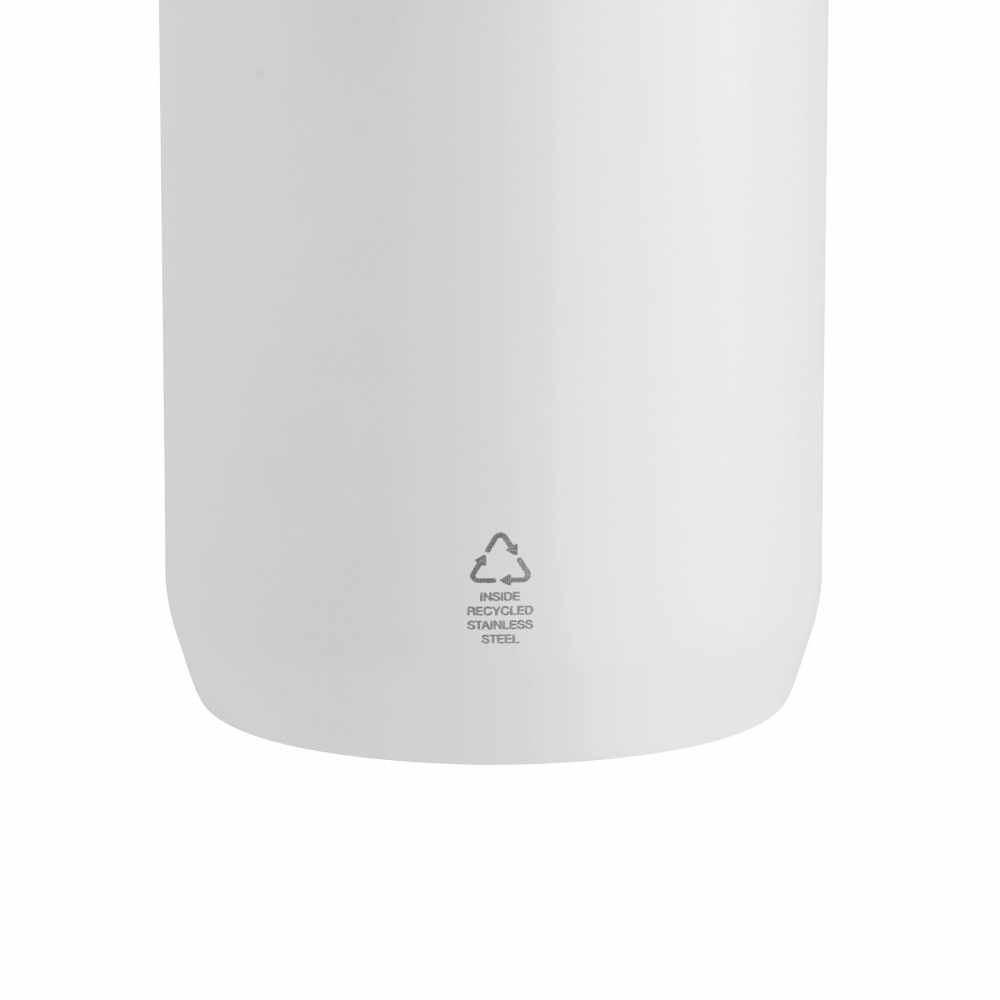 Doppelwandige Isolierflasche aus recyceltem Edelstahl. 90% recycelter Edelstahl und 10% Edelstahl. Füllmenge: 500 ml. Auslaufsicher. Nicht für kohlensäurehaltige Getränke geeignet.
