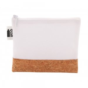 Individuelle Reißverschluss-Kosmetiktasche aus 600D RPET Polyester und natürlichem Kork mit vollflächigem Sublimationsdruck. Mindstmenge: 50 Stk.