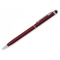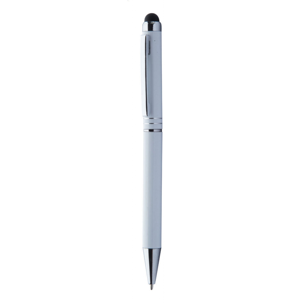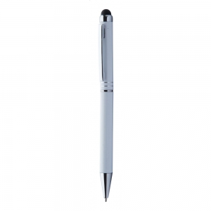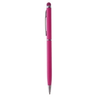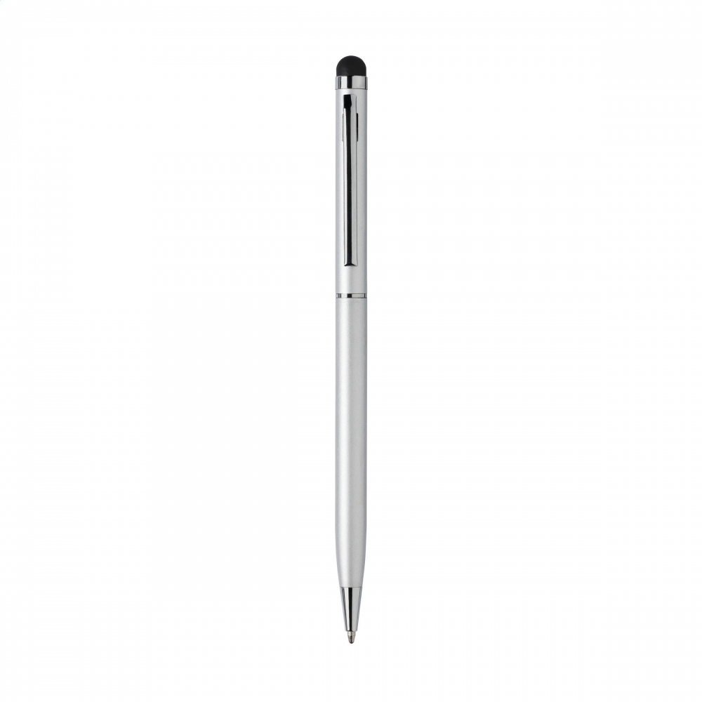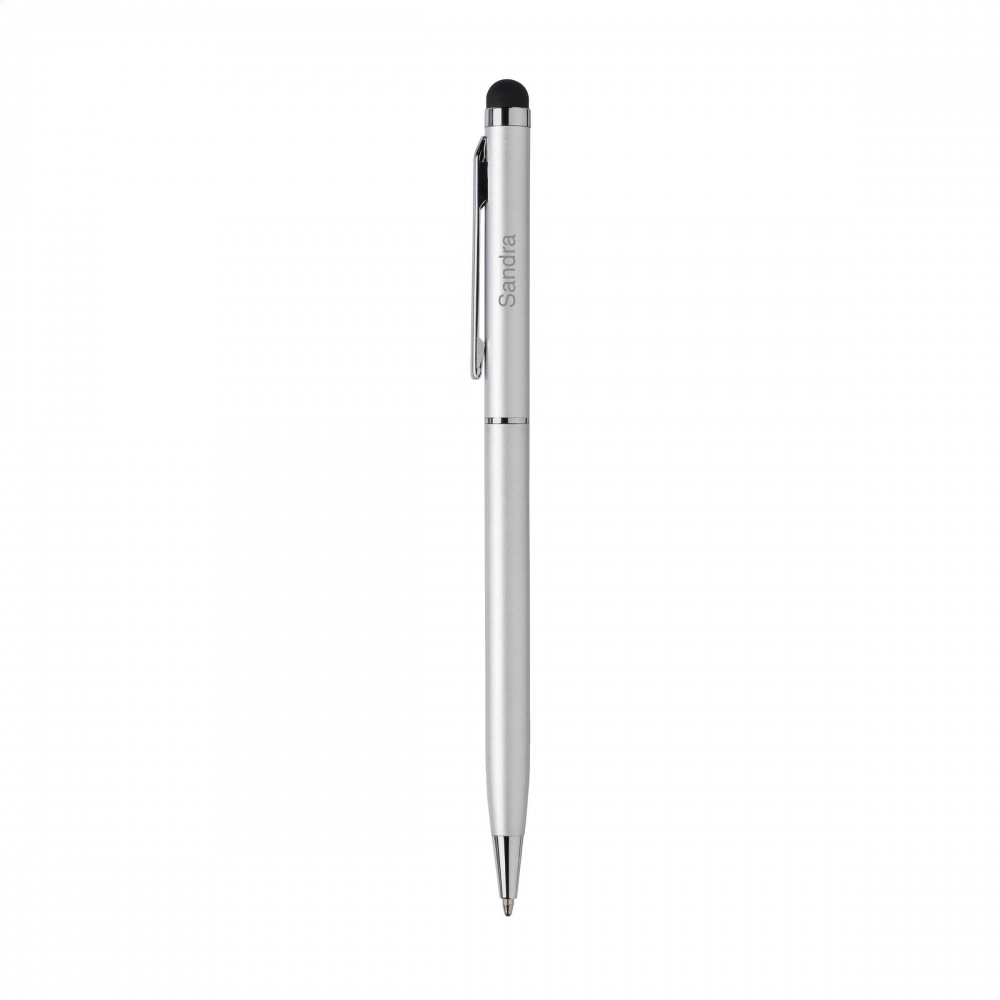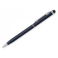 Blauschreibender Metallkugelschreiber mit gummiertem Pointer zum Bedienen von Touchscreens (wie iPhone/iPad), hochglänzenden Akzenten und Dreh-Klicksystem.