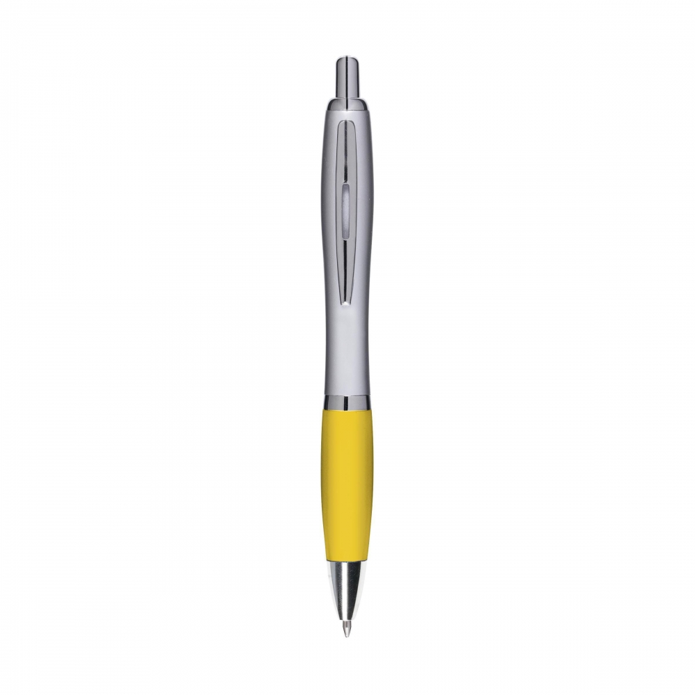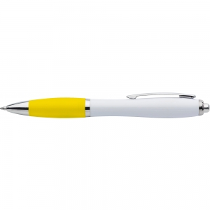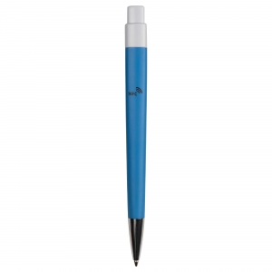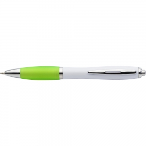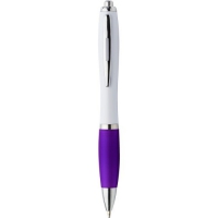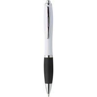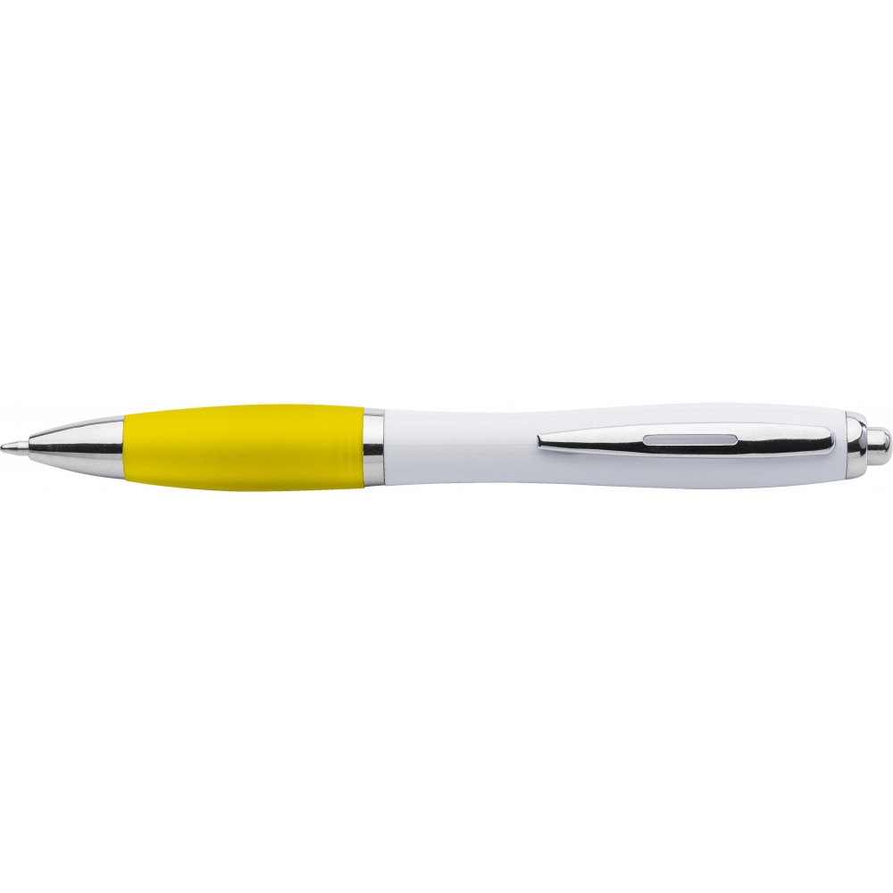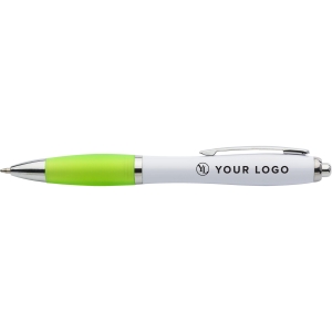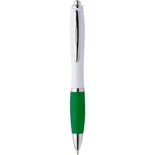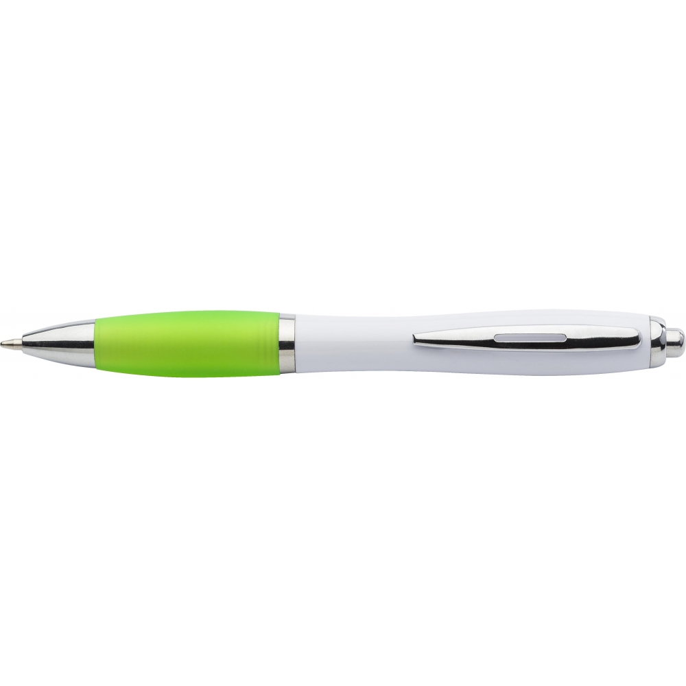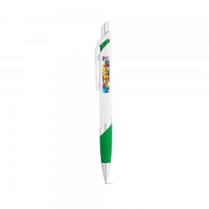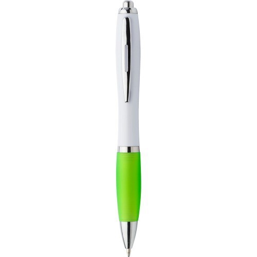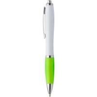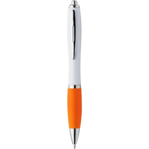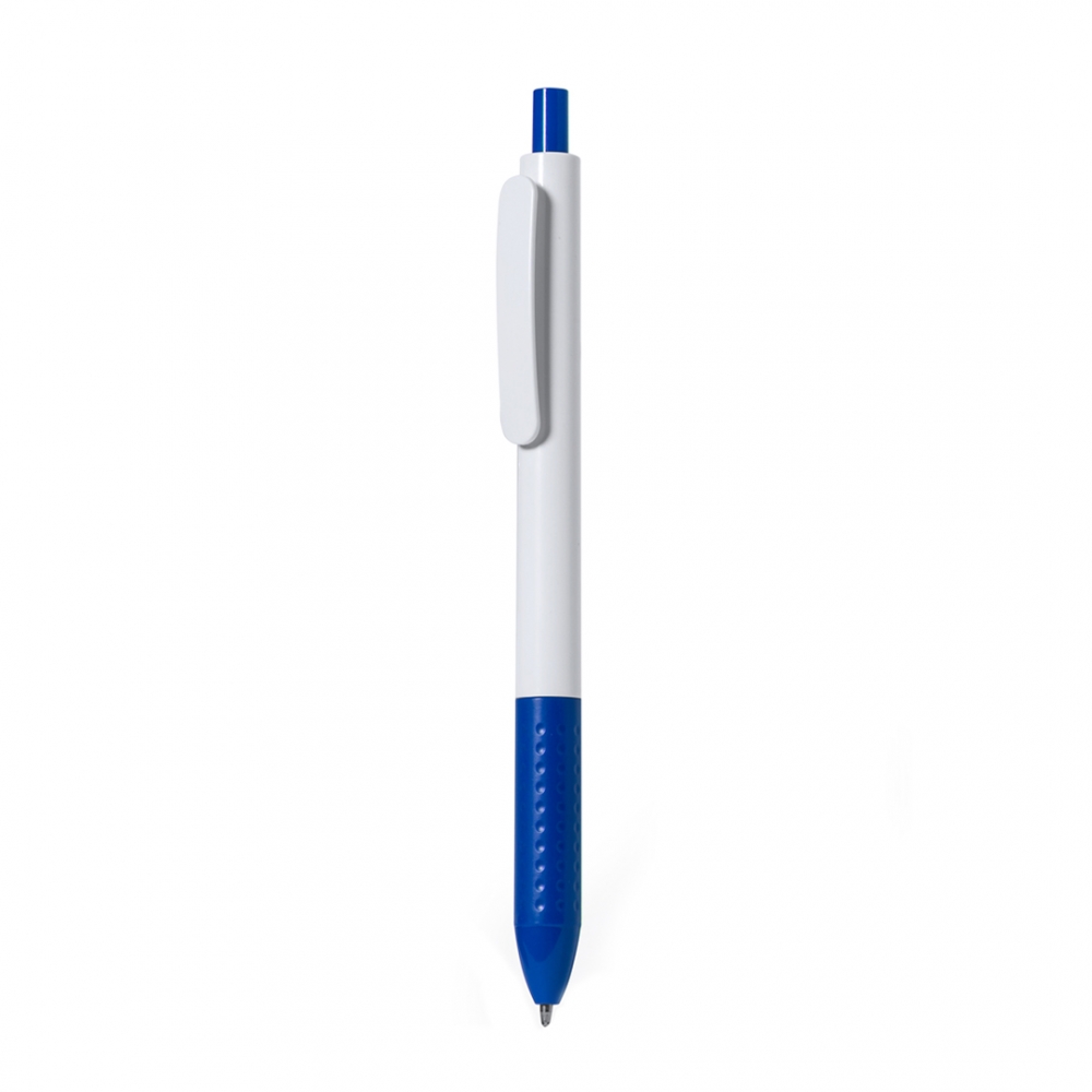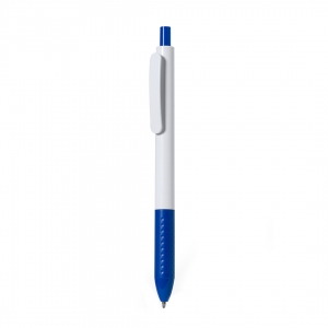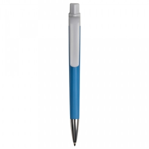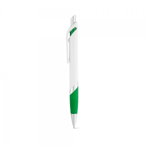 Druckkugelschreiber aus widerstandsfähigem ABS. Hergestellt in einer eleganten Kombination aus Schaft und Clip in Weißtönen. Druckknopf und Griff sind in verschiedenen leuchtenden Farben erhältlich. In blauer Tinte.