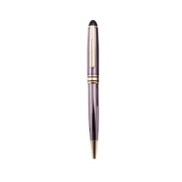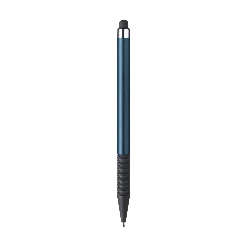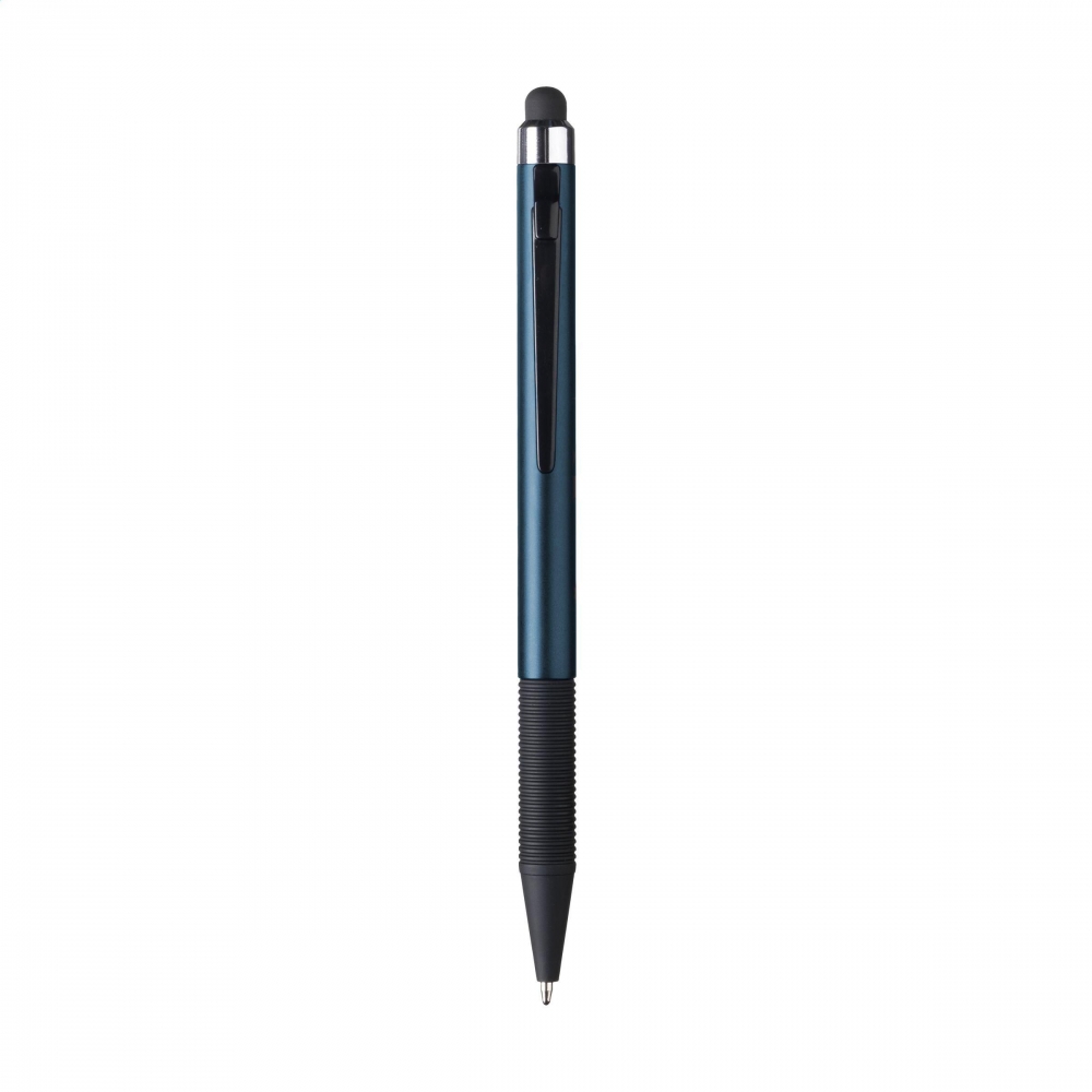 Blauschreibender, leichter Kugelschreiber mit Oberteil zum Bedienen von Touchscreens (wie iPhone / iPad). Schlankes Gehäuse in Metalloptik mit Clip als Druckknopf und griffigem Gummivorderteil.