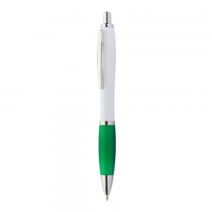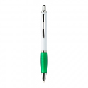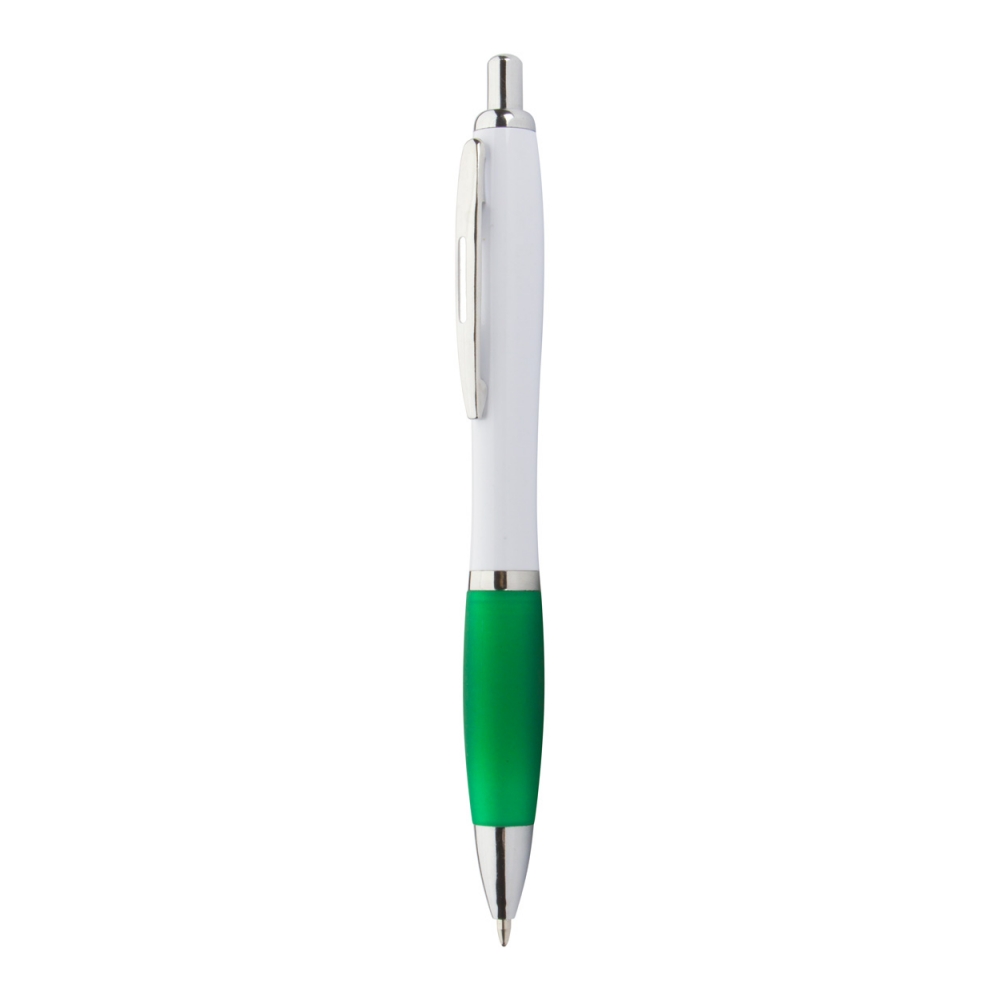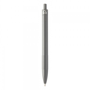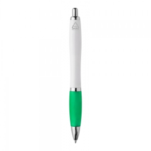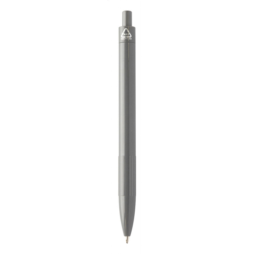 Kugelschreiber aus recyceltem ABS-Kunststoff mit weißem Schaft, farbigem Griff und verchromten Teilen, blauschreibend.