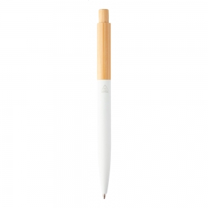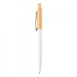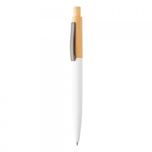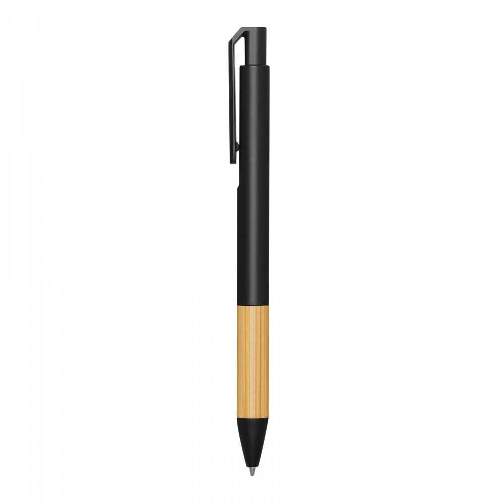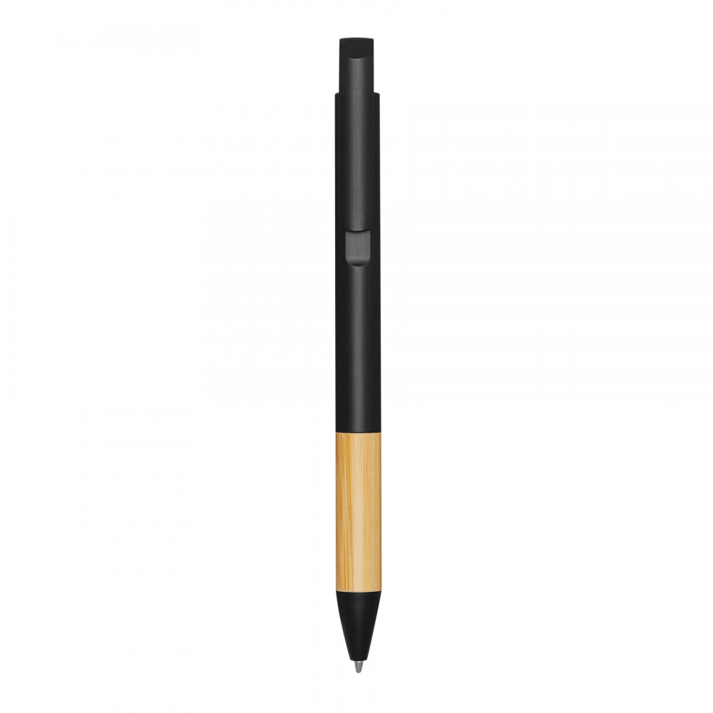Kugelschreiber aus recyceltem ABS und einem Drücker aus Bambus. Er verfügt über eine blauschreibende Kunststoffmine. Ihre Werbung drucken wir unterhalb vom Clip aus den Schaft.