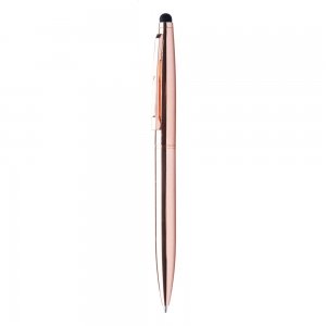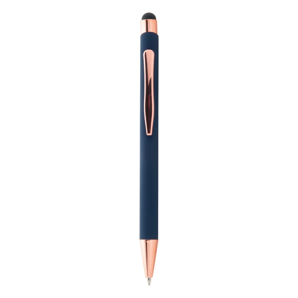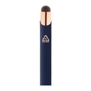 Kugelschreiber mit Touchpen aus recyceltem Aluminium, mit gummierter Oberfläche und roségoldenen Elementen. Mit Spezialbeschichtung für Spiegelgravur in Roségold, blauschreibend.