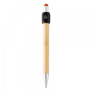 Kugelschreiber aus Bambus mit Touchpen und Fidget Spinner aus recyceltem ABS Kunststoff. Blauschreibend.