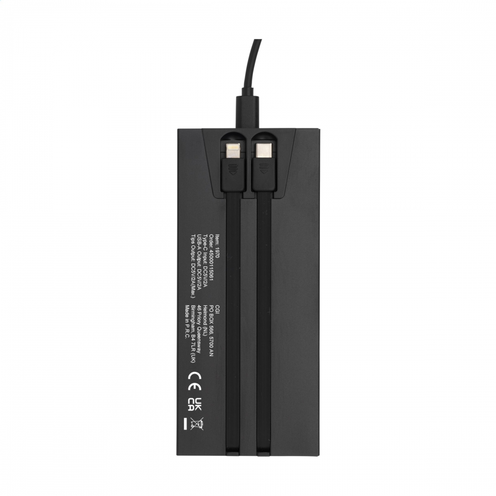Leistungsstarke Powerbank mit recyceltem Aluminiumgehäuse. Ausgestattet mit 2 integrierten Kabeln, Lightning und USB-C-Anschluss. Mit dieser Powerbank können Sie zwei beliebige Geräte gleichzeitig aufladen. Die Powerbank unterstützt Passthrough-Laden, was bedeutet, dass Sie Ihre Geräte aufladen können, während die Powerbank selbst aufgeladen wird. Die Powerbank ist mit einer Kontrollleuchte und einem leistungsstarken, wiederaufladbaren 10.000-mAh-Lithium-Ionen-Akku ausgestattet. Typ-C-Eingang: DC5V/2A. USB-A-Ausgang: DC5V/2A. Output Kabeln: DC 5V/2A (max.). Inklusive Ladekabel von USB-A auf USB-C und Gebrauchsanweisung. RSC-zerzifiziert. Gesamtes recyceltes Material: 10%. Durch die Verwendung von recyceltem Aluminium werden bei der Herstellung dieses Produkts weniger neue Rohstoffe verwendet. Das bedeutet weniger Energieverbrauch und weniger Wasserverbrauch. Pro Stück in einer Verpackung.