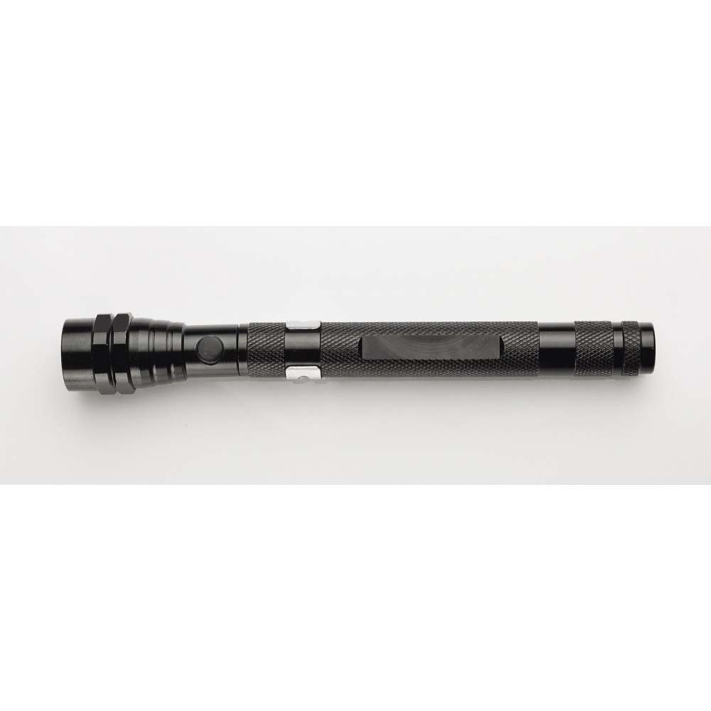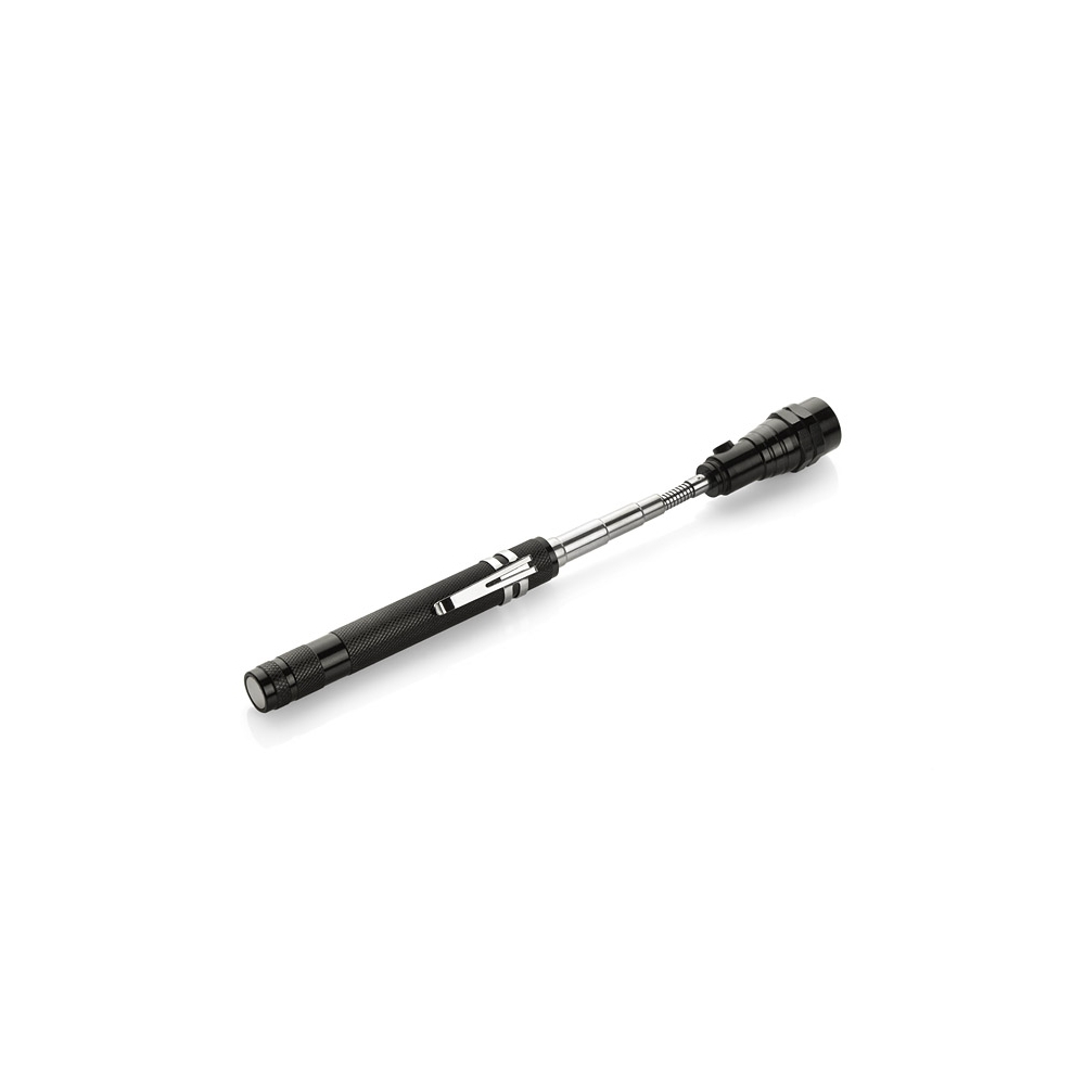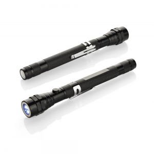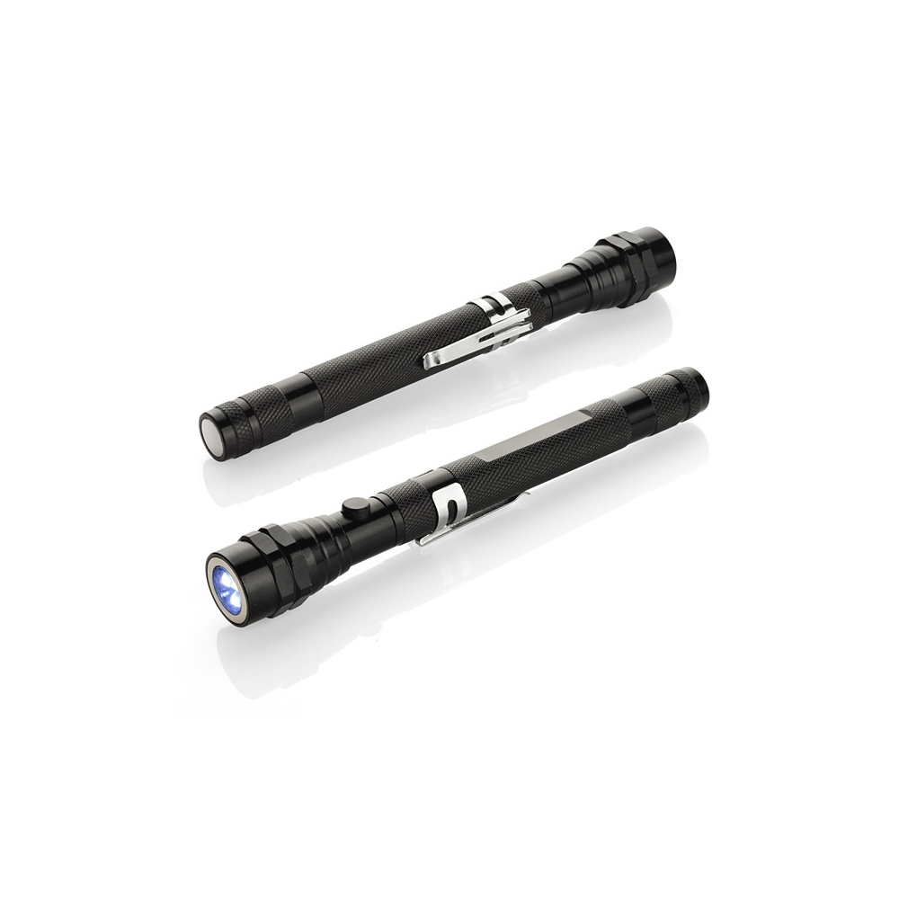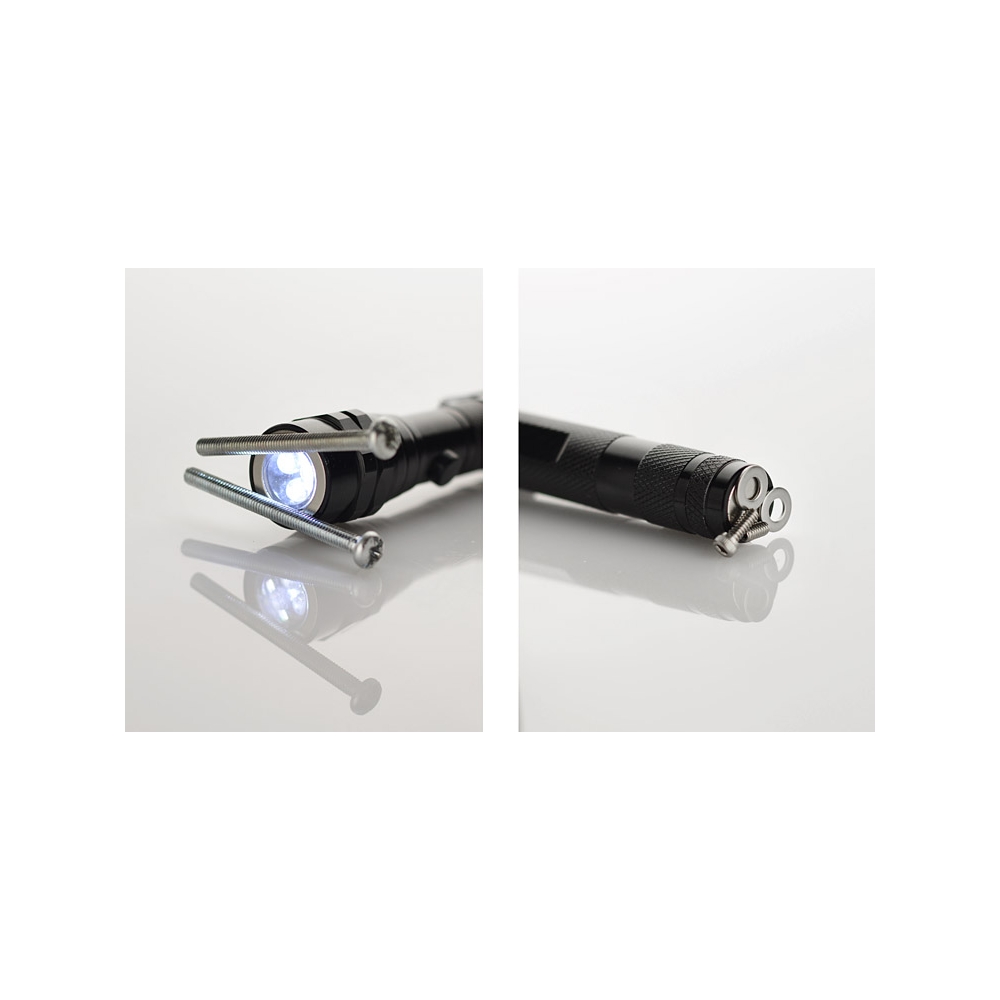 Außergewöhnliches Werbegeschenk mit einer breiten Palette von Anwendungen. Komplett aus Metall hergestellte Leuchte verfügt über ein versenkbares Teleskop und beweglichen Kopf mit 3 LEDs. Ein zusätzlicher Vorteil sind an beiden Seiten der Leuchte platzierte Magneten. Die Konstruktion ist sehr robust und mit einer Metallklammer zum Aufhängen ausgestattet. Kennzeichnung auf einem speziell präparierten flachen Oberfläche auf dem Handgriff möglich