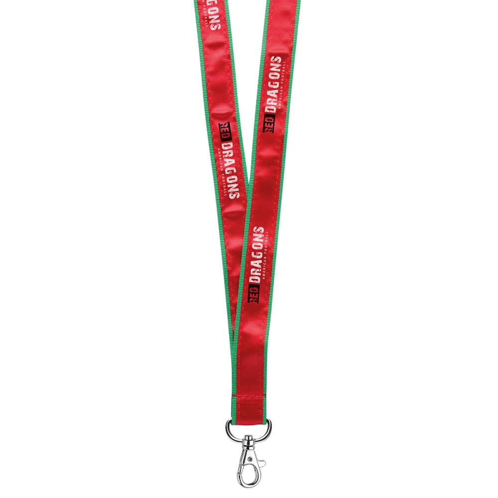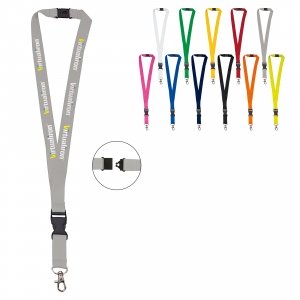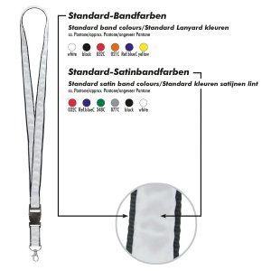 Polyester-Lanyard, 15mm breit, mit Metall-Karabiner, Panikverschluss und vollfarbiger Bedruckung. Der Preis ist inkl. Sublimationsdruck auf beiden Seiten. Mindestmenge: 100 Stk.