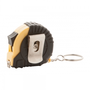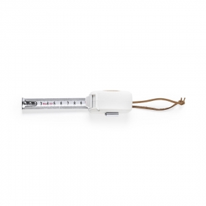 ABS-Maßband mit einem Polyester-Armband. 3 Meter in der Länge. Band aus Metall (16 mm), bedruckt mit Zentimetern und Zoll. Inklusive Druckknopf mit Schloss. Einzeln verpackt in einer braunen Pappschachtel.