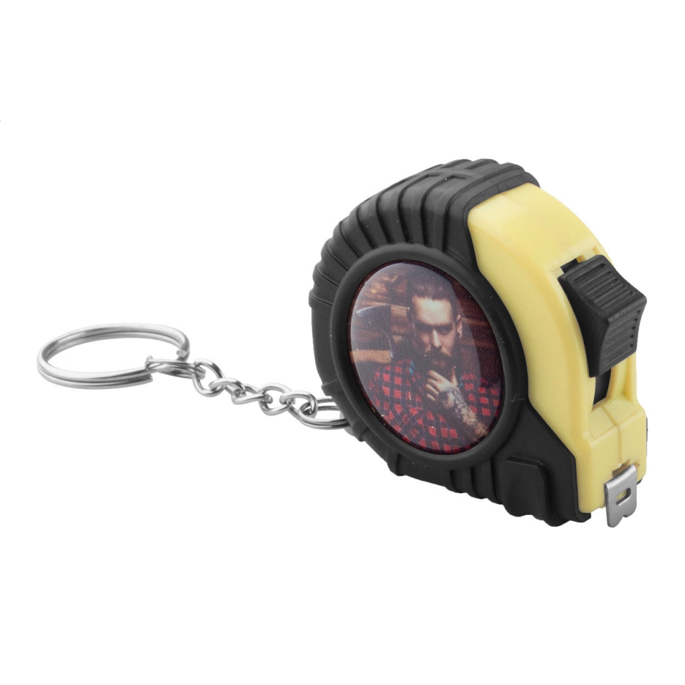 Schlüsselanhänger aus Kunststoff, mit LED-Lampe (weiß), Flaschenöffner aus Metall, Maßband (Länge ca. 1 m) und Metall-Schlüsselkette.