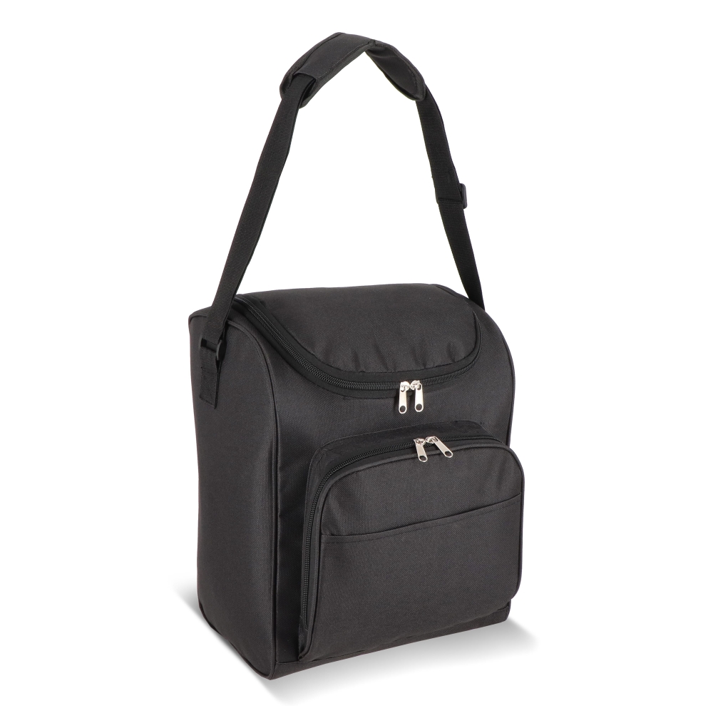 13-Liter-Kühltasche aus recyceltem PET 600D mit einer weiten Öffnung oben. Mit Aluminiumfolie gefüttert und einer Vordertasche mit Reißverschluss. Ideal für Getränkeflaschen, Picknicks und Einkäufe.