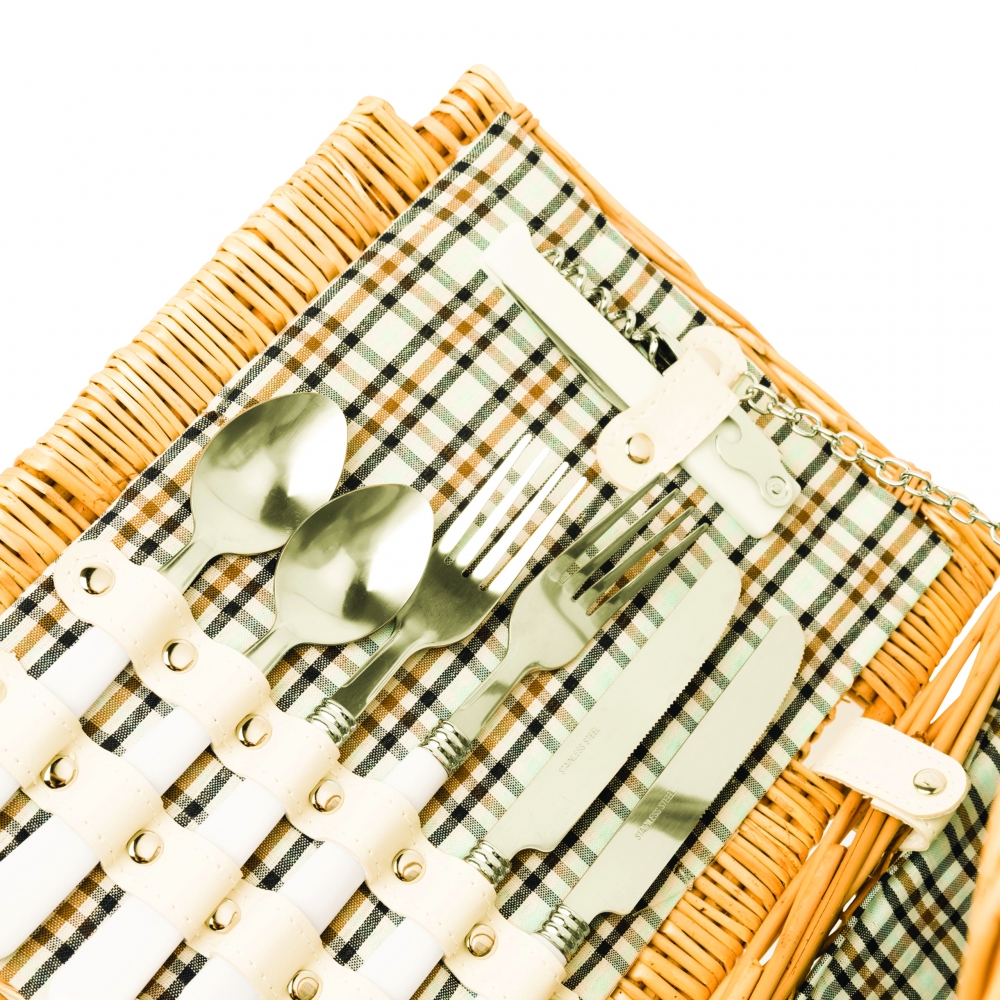 Picknickkorb für 4 Personen, Set bestehend aus jeweils 4 Gabeln, Messern, Kaffeelöffeln, Tellern und Kaffeebechern.