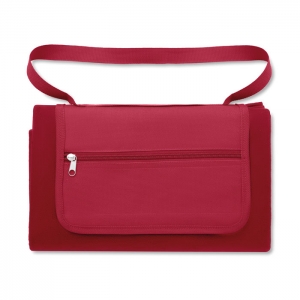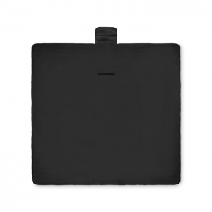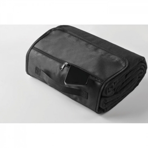 Picknickdecke aus RPET Polar-Fleece 150 g / m² (68% recyceltes Polyester/32% Polyester) mit wasserabweisend beschichteter PEVA-Rückseite. Front-Reißverschlusstasche und kurzer Griff.