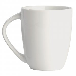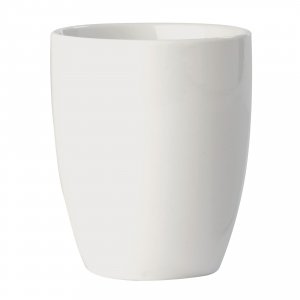 Weißer Porzellanbecher im bauchigem, konischen Design mit großem Henkel. Ein Topseller unter den Bechern.