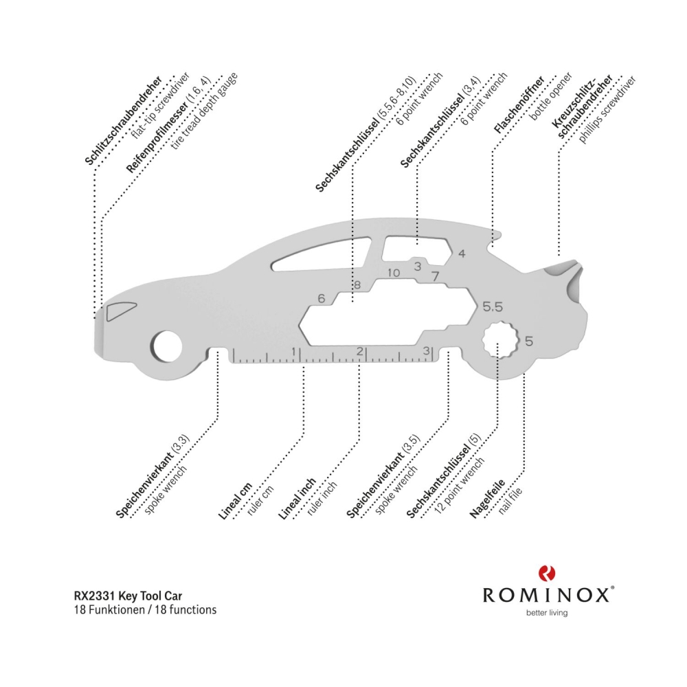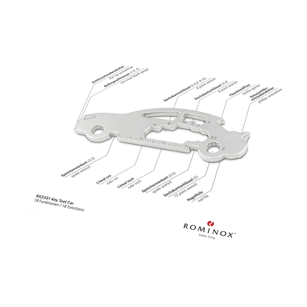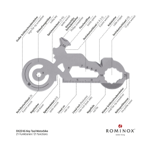 Artikel-Nr: ROP2K2102dÜberraschen Sie Ihre Handwerker mit Multifunktionstools als Schlüsselanhänger: ein ideales Geschenk nicht nur zum Geburtstag oder zu Weihnachten und nicht nur für Männer. Mit den kleinen Begleitern von ROMINOX® haben Sie die praktischsten Werkzeuge wie Schraubenzieher, Lineal oder Sechskantschlüssel immer dabei, egal ob im Alltag, im Büro oder auf Reisen. Das Key Tool Motorbike / Motorrad mit 21 Funktionen inkl. Einkaufswagenlöser kommt in einem "Merry Christmas”-Mäppchen inkl. Funktionsbeschreibung. "An die Werkzeuge, fertig, los"! Finden Sie die perfekte Kombination aus Ihrem Lieblings Keytool und Motiv-Mäppchen. Auf Wunsch auch mit Gravur und / oder im Mäppchen im Eigendesign erhältlich.