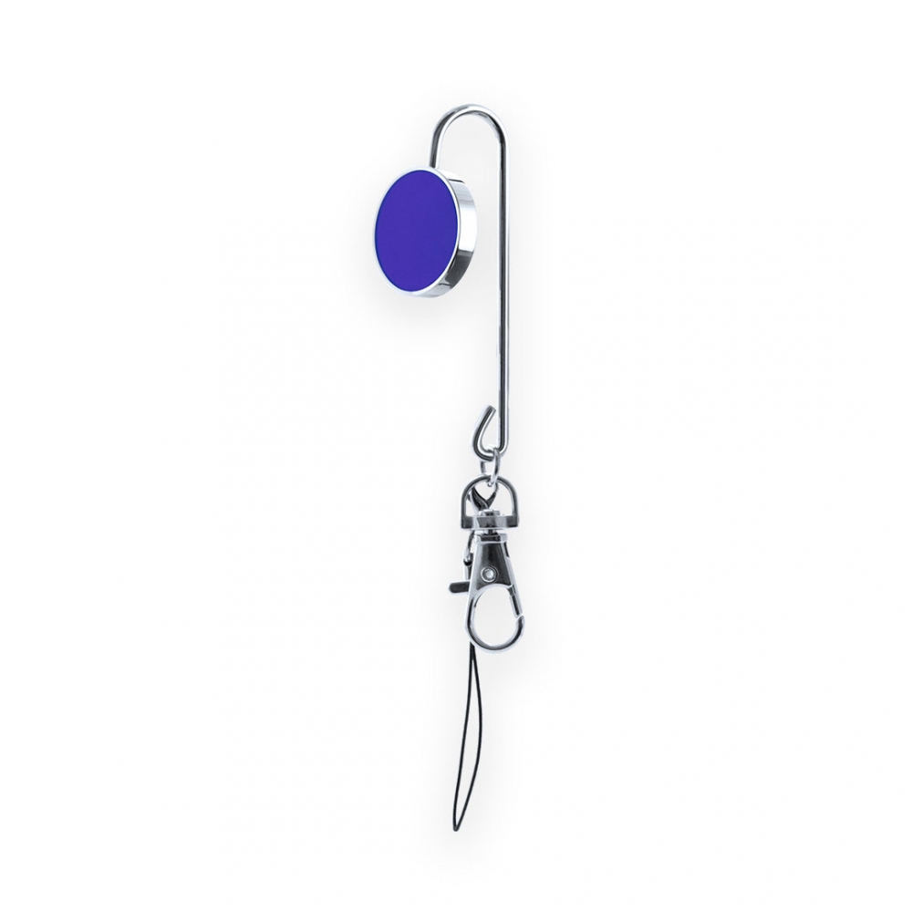 Schlüsselanhänger mit Handtaschenhalter aus Metall. Haken mit Kunstlederbesatz in kräftigen Farben sowie Trageschlaufe mit Karabinerverschluss. Präsentiert in einer individuellen Hülle.