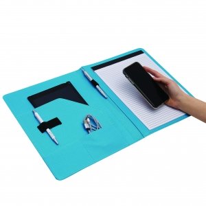 Konferenzmappe aus PU mit Metallecken, ca. DIN A5-Format, Einsteckfach und Stifthalter (ohne Stift). Lieferung erfolgt ohne Schreibblock.