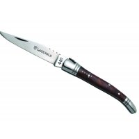 Unsere Laguiole-Taschenmesser erfüllen hohe Qualitätsstandards in allen Bereichen: Klinge: 440-er Edelstahl, auch 'Chirurgenstahl' genannt, verbindet optimal die Vorteile von Chrom (Schutz vor Rost) und Kohlenstoff (für eine scharfe Klinge). Bei normalem Gebrauch bleibt die perfekte Schneidekraft monatelang erhalten. Der Korkenzieher (3 Spiralen) ist aus Edelstahl gefertigt. Zwei Edelstahlkronen: Diese Metallfassungen verstärken die Stabilität des Messers und runden sein Erscheinungsbild ab. Die Kronen unserer Messer sind grundsätzlich aus Vollmetall. Der Griff: Das Thuyaholz mit seiner starken Maserung verleiht diesem Klassiker das gewisse Etwas. Die Maserknollen findet man an den Wurzeln längst abgestorbener oder gefällter Sandarak-Bäume. Als Ornamente trägt dieses Modell ein Hirtenkreuz in Einlegearbeit, sowie die typische 'Laguiole-Biene' und ins Metall gravierte Muster auf dem Rücken des Griffs.
